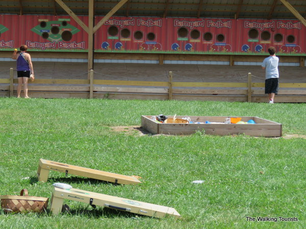 Kids of all ages can test their bouncy skills on a giant air pillow that’s part of the Barnyard Bonanza, a play area that also includes an arcade for people to toss footballs, baseballs and basketballs. A rope spider web can be climbed on. Younger kids can play in a sandbox. There are also cornhole games for all ages to play.