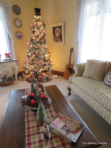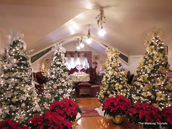 As you visit the master and guest bedrooms, you’ll find each room elegantly decorated with Christmas trees, ornaments and decorations. A third-floor dance hall has one of the most beautiful room displays I’ve ever seen. With poinsettias as anchors, trees with white- and cream-colored ornaments and lights seemingly lead the path to a lighted bowl of ornaments and trimmings.