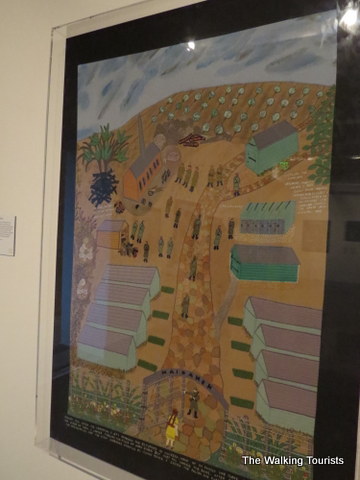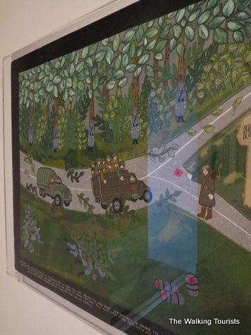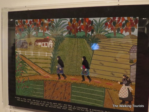 In 1939, the Nazis arrived and took over the village. The Nazis roughed up people, including her father. Esther said they threatened to cut off his beard, as well as kill him. At this point, the borders on the art pieces were black, as if quietly saying the dark days of her life began.