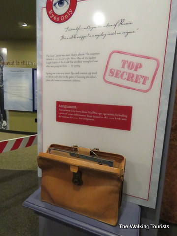 A briefcase is featured in the display, as spies played a big role on both sides.