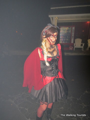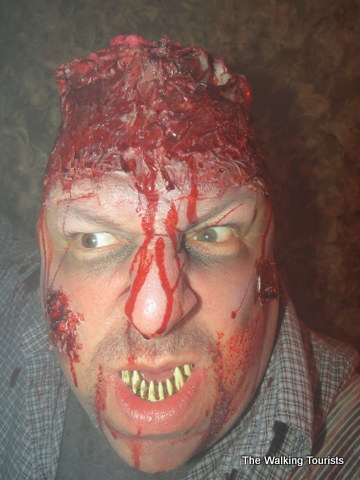 The mazes include: Cornstalkers (similar to “Children of the Corn”), Miss Lizzie’s Chamber of Horrors (an evil, freaky wax museum), London Terror (where you are likely to run into Jack the Ripper), Zombie High (where they say you’re “Saved by the Hell”), Lore of the Vampire (vampires, of course), Asylum Island (freaky insane patients (or, as I like to say, Thanksgiving at the in-laws)) and Bloodshed (a human slaughterhouse).