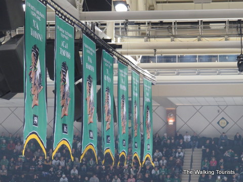 The arena has the Sioux “logo” sketched on the floor. This has been considered controversial in recent years, especially when the school was negotiating with the National Collegiate Athletic Association in an attempt to keep the nickname. The NCAA had ruled Native American team names as offensive and unacceptable. Schools had to change their nicknames unless they received support from the tribes within their state. UND didn’t have that support from all the state’s tribes, so the nickname was dropped a few years ago.