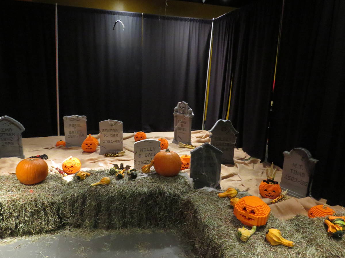 The cemetery had Lego-made pumpkins, corn stalks, bats and even a Frankenstein monster head scattered about.