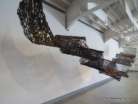 The exhibit features some impressive artwork by local and international artists. We’ve seen some of the artists’ works in previous exhibits. It’s kind of fun to be able to say you recognize an artist’s work. Susan Knight is one such person. We noticed her work during the “Fabric” exhibit. So, her creation, “Water Bank Boogie,” a paper cut project representing soil along water banks. Each color represents a color code used by researchers.