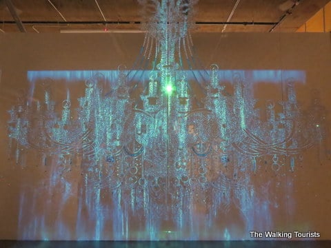 “Garden of Water” combines video with chandeliers. It creates an image of rain washing out the chandeliers. A few seconds later, spider silhouettes come out and seem to build webs before having water wash everything away. Ran Hwang does an impressive job with the multimedia project.