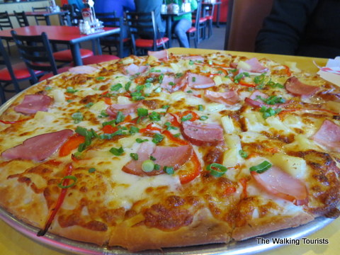 Our favorite is the Polynesian – sweet Thai chili sauce as the base sauce, topped with Canadian bacon, pineapple, scallions and red peppers. It is sooooooooo good.