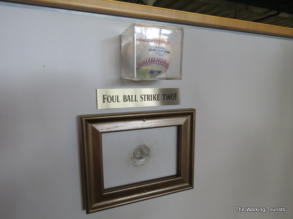 An interesting item in the press box is the hole in the wall caused by a foul ball that popped up from home plate to the press box.