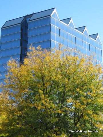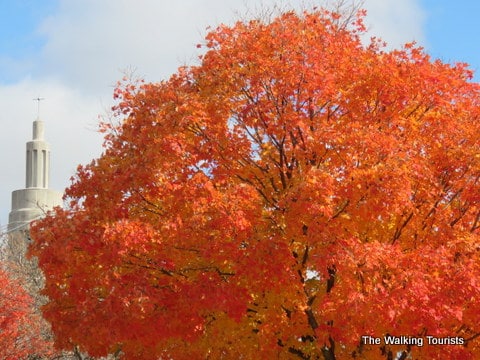 In Omaha, our favorite spot to take in the fall colors is downtown Omaha. The Gene Leahy Mall provides a great setting for the colors, with a backdrop of some skyscrapers. The trees line the lagoon that features small waterfalls and eventually ends in the Heartland of America Park.