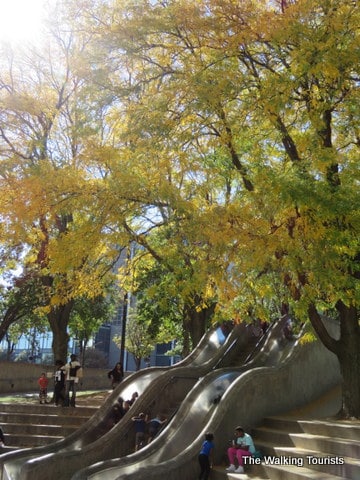 The Mall features sculptures, an arch and giant slides popular with adults and children. The slides are a local attraction unto themselves. People will bring plastic wrap or card board to help increase their speed coming down the slides.