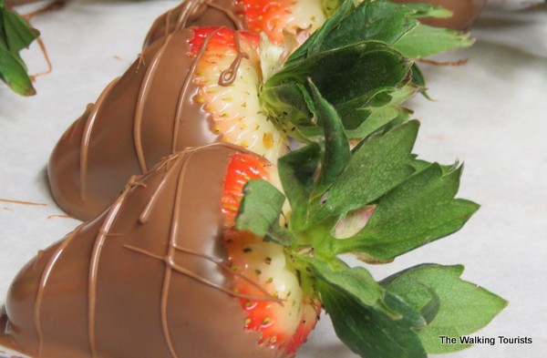 Watching the team create chocolate-dipped strawberries is like watching an artist create a beautiful painting. We watched as one team member dipped strawberries into a hot pot of milk chocolate and then drizzle the chocolate on other strawberries, creating artistic designs.