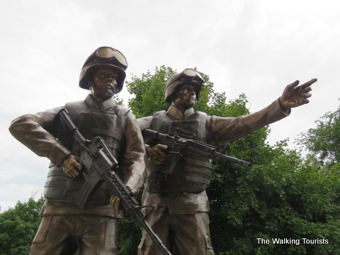 Another memorial honors the men and women who have served in recent wars, including Iraq and Afghanistan. It features two soldiers looking ahead, ready for action.