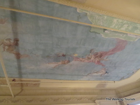 A sitting room has paintings on the ceiling.