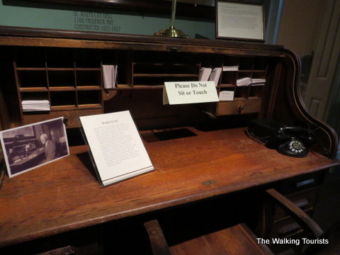 An office exhibit depicted life during earlier times. The desk was set up as a businessman likely would have had it back in the day.