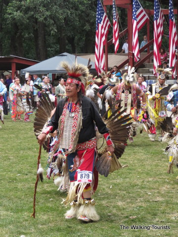 Most powwows will begin the Grand Entry of dancers led by military veterans carrying the tribe’s war staff, American and tribal flags. The three symbols are prominently displayed in the center of the dance grounds. Ringing the dance circle will be American flags flying from poles. Some tribes use flags donated by the families of deceased tribal veterans, in their memory. Tribes may have drum groups perform songs for each service branch.