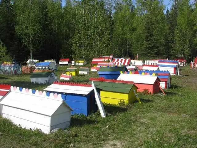 A cemetery contains spirit houses over each grave, combining traditions of the Dena’ina and Russian Orthodox Church. The Dena’ina traditionally cremated people when they died. The Church didn’t allow that, instead burying its dead so they could start a 40-day spiritual journey. Tribal members began laying blankets and installing spirit houses over graves to protect and shelter the person as they began their journey.