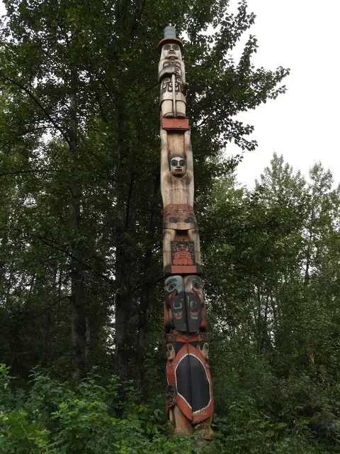 Outside, traditional homes are located, including earth lodges and cabins. You’ll also find totems representative of southeast Alaska tribes.