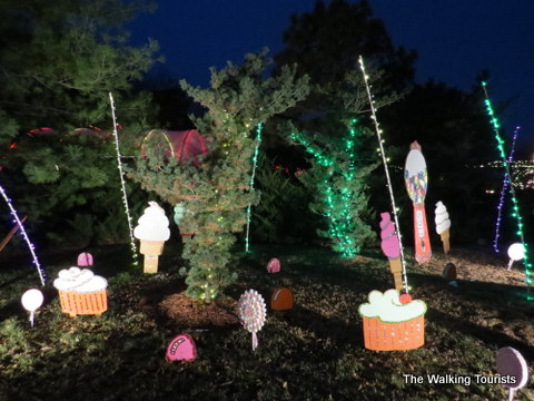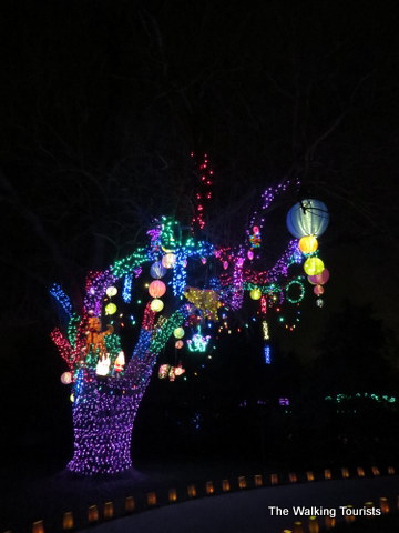 My favorite display was a tree near the end of the walk. The trunk and a few branches were decorated with lights. Then, colorful decorations were added – Santa and a snowman sit at the top of the trunk. A “flying” pig hangs from one branch. Several other decorations light up the area.