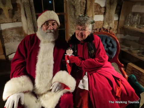 Santa Claus and Mrs. Claus greet visitors at a small log cabin that subs as the visitors center during the day.