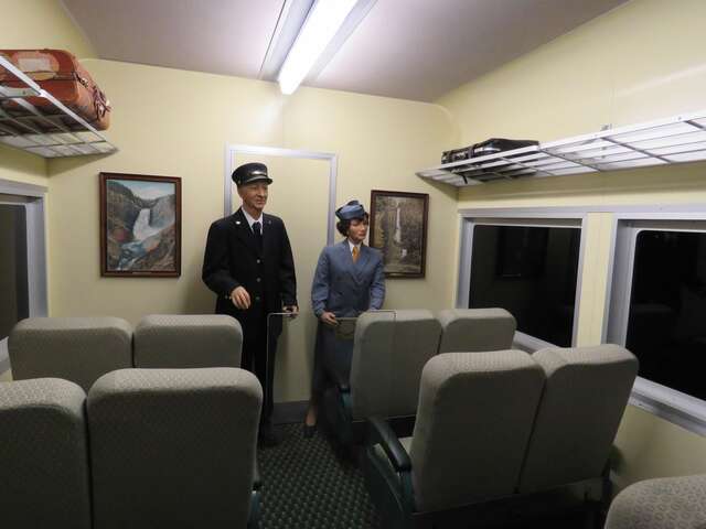 The passenger era of 1931-71 includes various dinnerware patterns used in restaurant cars, as well as employees’ uniforms. A 360-degree theater showcases the history of the railroad’s passenger service.