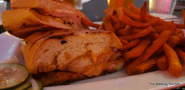 Lisa chose the “healthy” option for dinner, going with a maple-glazed Canadian salmon atop a bed of lettuce, with cucumbers, cherry tomatoes and craisins, with asiago cheese grated over it. I went with the server-recommended Midnight Cubano. With pork carnitas, shaved ham, swiss cheese and the Tavern’s Bang-Bang sauce on Cuban bread, it exceeded expectations with great texture and flavor. Adding a sliced of the tangy “cuke” (cucumber) slices, it was a great meal. Oh, the sweet potato fries were delicious, too.