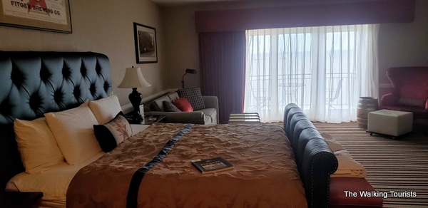 Our suite was impressive. With a king-size bed, comfortable work desk, kitchen and sitting area featuring a sofa and chairs, as well as a whirlpool bath, the suite included a scenic view of Lake Superior from the balcony. Vintage items, such as whiskey barrel and suitcase served as an end table and coffee table, respectively.