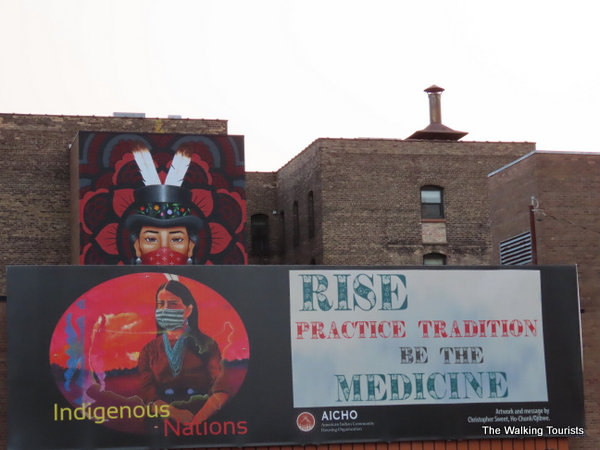 I love how some Native American artists have turned to art to help tell the history or share culture. A few murals are located around Duluth, including a jingle dress dancer on the side of the American Indian Community Housing Organization Galleries. She looks over the Duluth area, protecting the Ojibwe land and water. The mask is symbolic of the water protectors who were at Standing Rock, North Dakota, in 2017. A second mural at the Seafarers Center features a large hand offering tobacco, with dragonflies flittering about. It also includes underwater scenes.