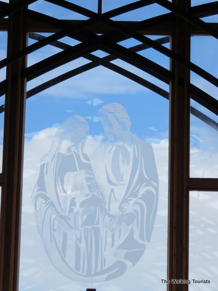 The chapel is 49 feet tall with glass walls. Arching wood resembles waves of grain. Etched on the southern window is a portrait of the holy family – Joseph, Mary and baby Jesus. The chapel’s altar is located under the art work.