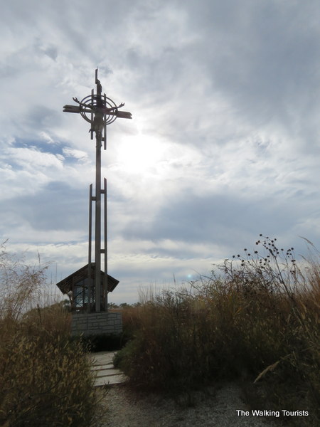 A stainless steel crucifix overlooks the interstate. Standing at about 40 feet tall, it professes the shrine’s Catholic identity.