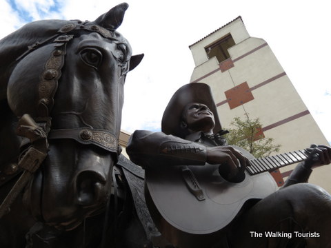 Visitors are welcomed to the museum by a statute of Autry singing next to his horse.