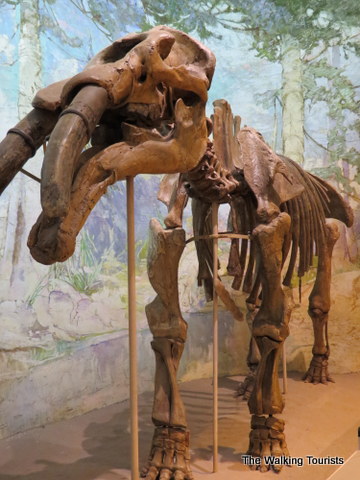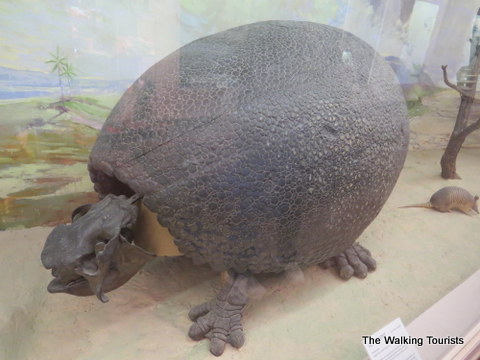 A giant relative of today’s armadillo stands on display – a Gluptodon. It could stretch 10 feet long and weight two tons. The animal lived about 2.5 million years ago.