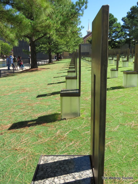 Nearby, 168 empty chairs occupy a green space. Each represents a person who died on each floor of the Murrah Building. The chairs are made from bronze and glass, and at night, when lit, appear to float.