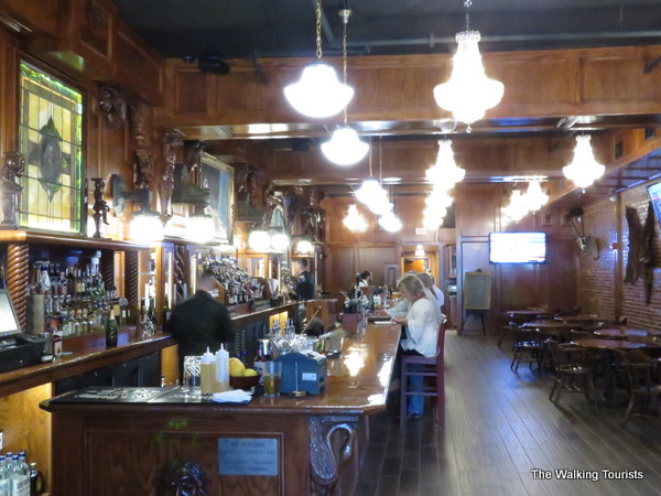 Dark wood highlights the saloon. With whiskeys and other liquor lined up behind the bar, you can imagine a cowboy tieing up his horse and moseying on in for a shot or two.