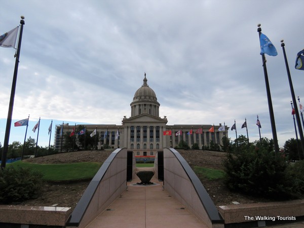 A monument honoring the 17 Native American tribes that call Oklahoma home stands on the capitol’s grounds. Designed as a mound with the four traditional paths in the middle, each tribe’s flag flies above the monument.
