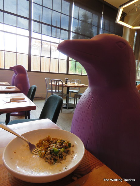 Lunch at Mary Eddy’s at the hotel provided us an opportunity to try new dishes, including a lamb sandwich melt and a campanelle. The restaurant changes its menu every two weeks, so it may not be a good idea to latch on to a favorite. You never know who may join you at lunch, as we welcomed a purple penguin to our party. Each hotel features different colored plastic penguins.