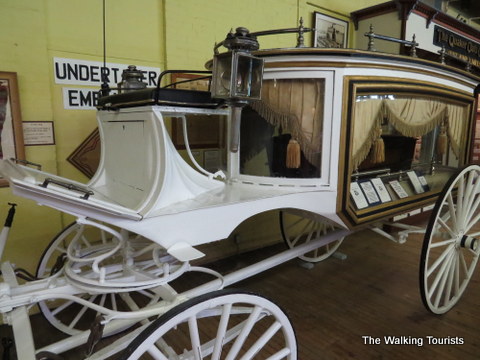 Horse-drawn hearses are displayed.