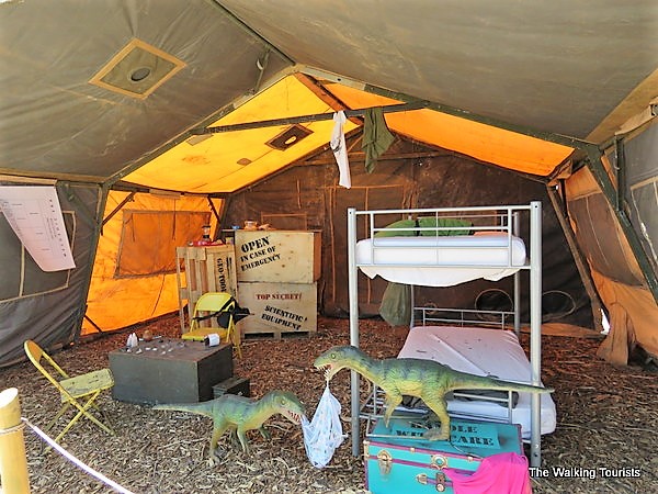 As visitors explore the 14-acre station, they’ll encounter props and scenes that put them in the middle of a paleontology dig area. From a base camp to dig spots, people encounter prehistoric creatures around curves and corners, including finding carnivorous Compsognathus scavenging through tents.