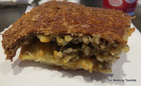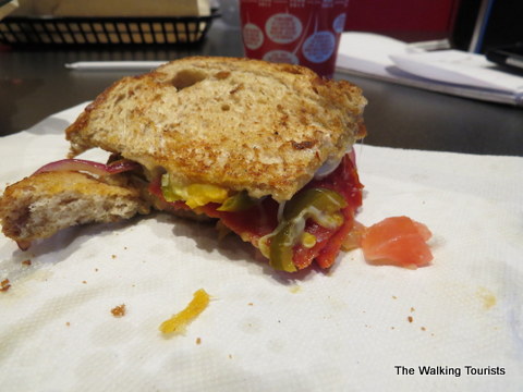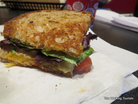 If your tastes border on hot and spicy, Tom + Chee can satisfy that. We tried the Hot and Spicy. Mallory was out after the first bite. I took a couple of bites. It came with pepperoni, cherry peppers, onions and pepper jack cheese on wheat bread.