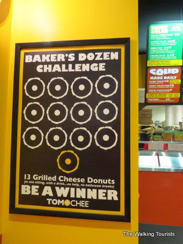 Tom + Chee has an eating contest for customers. The “Baker’s Dozen” challenges a customer to eat 13 grilled donuts. You eat 12 grilled cheese donuts. The 13th is a fancy one. If you finish them in one sitting (no restroom break allowed), you eat for free. Fail, and you are paying about $30 for the meal.
