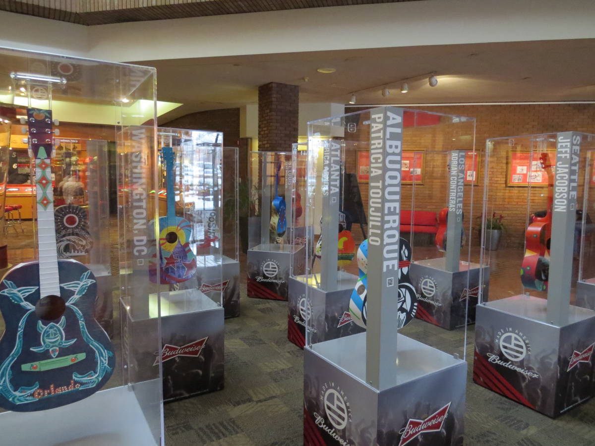 A display of guitars featuring American cities – such as St. Louis, Austin, San Francisco and San Antonio – sat in the welcome center. Each guitar featured artwork relative to the city, such as skyline, etc.