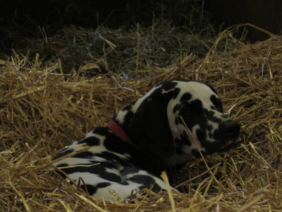 As we checked out the Clydesdales, I noticed a Dalmatian dog sleeping in one of the horse pens. He looked quite content to get some zzzz’s in the straw.