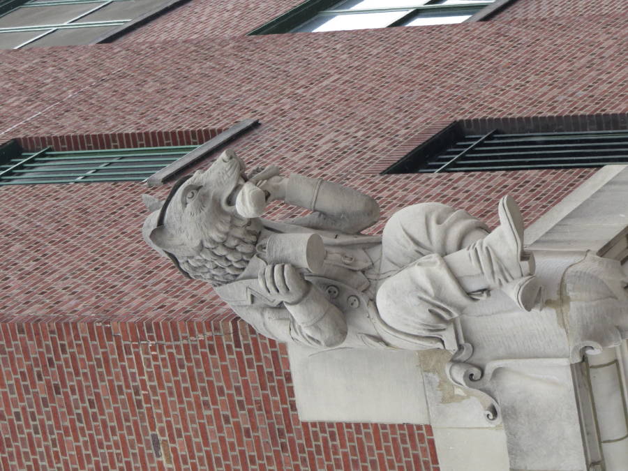 The “Budweiser” building once produced non-alcoholic drinks during Prohibition. Bevo the fox was used as the mascot for Bevo beer. Bevo sits on the four corners outside the building having a Bevo “beer” with his lunch.