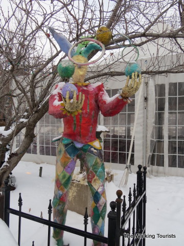 A block away offers a court jester statue in front on a restaurant. I thought it was a cool thing to check out on a snowy day.