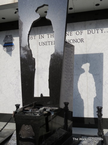 As we moved out way back through downtown, we came upon a police memorial. The design was interesting. The light presented an outline of a police officer against the building. In front of the design, a hat and gun belt lay.