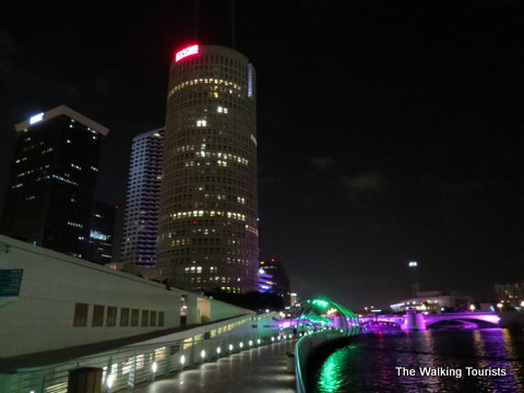 Following dinner at Ulele, we visited the newly completed portion of the Channelside river walk. The walkway’s overhangs resemble sailboat sails. They change colors throughout the evening. It’s a beautiful stroll along the river and downtown.