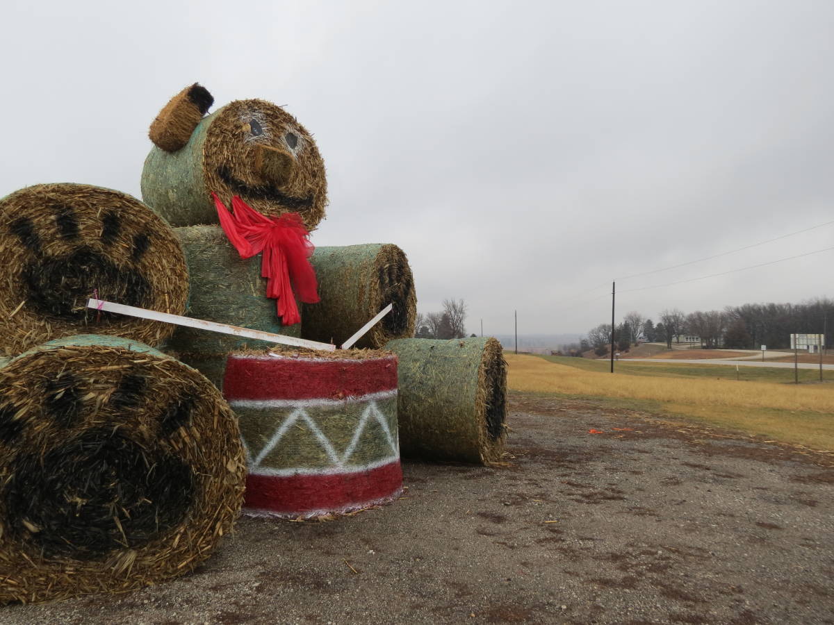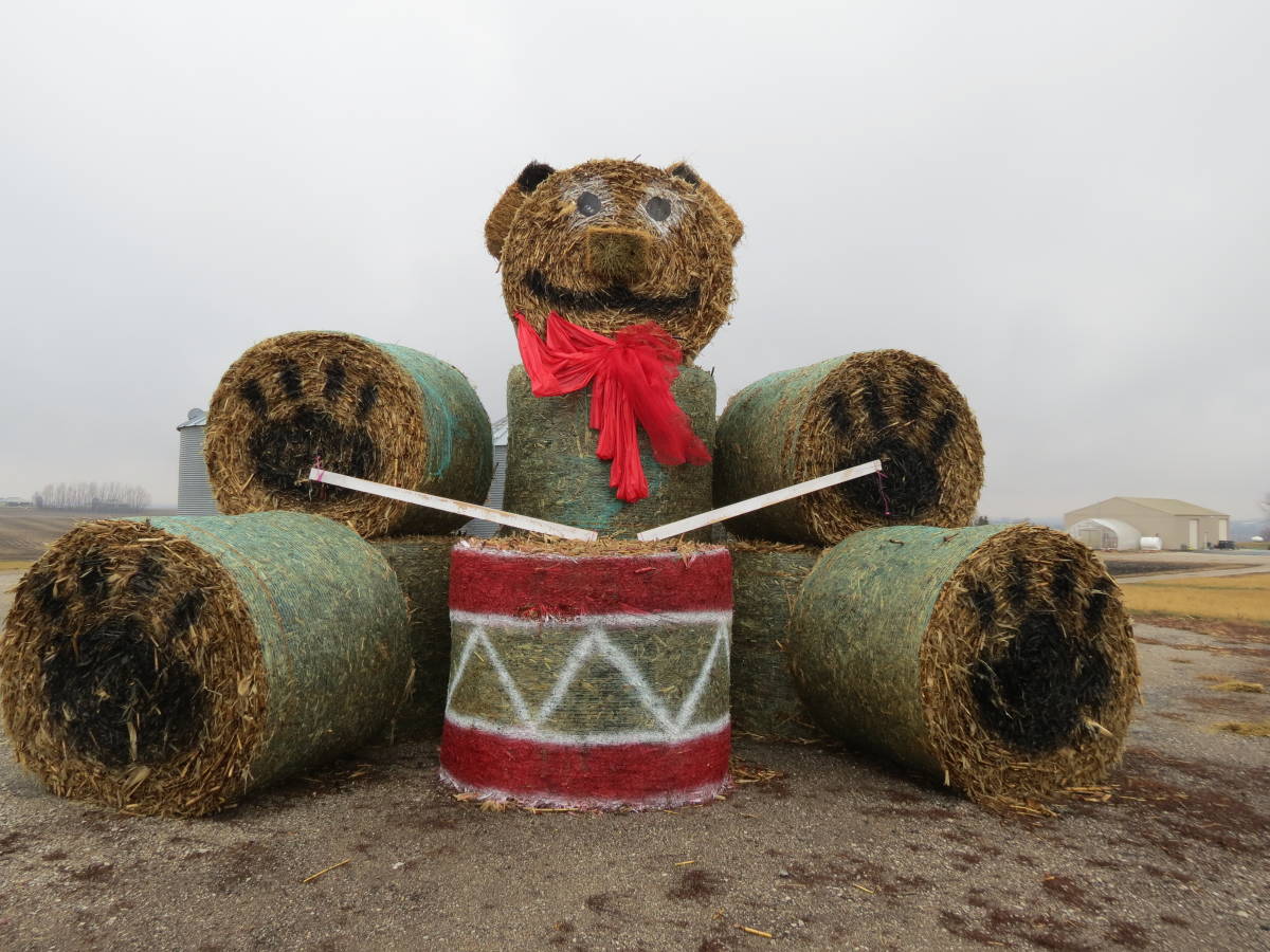 A local news channel ran a story about a farmer turning some hay bales into a holiday-themed teddy bear. Apparently, it welcomes passers-by the farm.