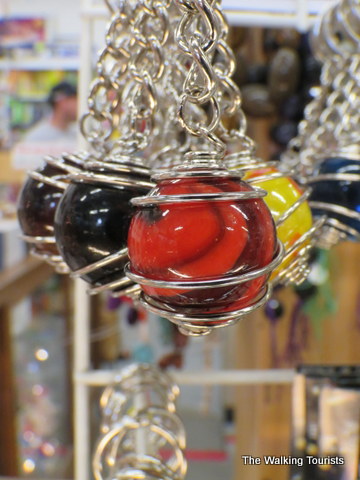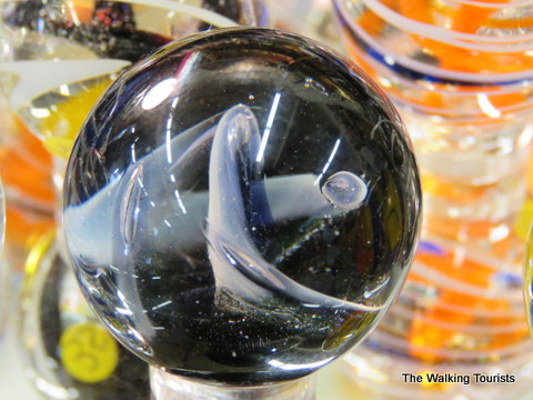 The store offers displays of the handmade marbles. Some of them have designs, such as the “man on the moon” or a psychedelic style.